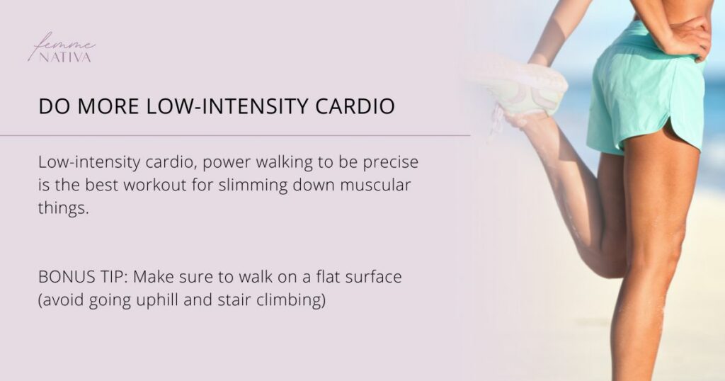 2. DO THE RIGHT TYPE OF CARDIO – Do more low to moderate-intensity cardio such as power walking. This type of cardio is the key to getting slim legs.
