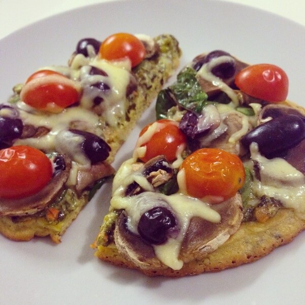 Ingredients (base) 1 tbsp coconut flour 1 tbsp buckwheat flour 1 egg white- 1 tbsp olive oil 1 tbsp water Salt, pepper and herbs, to taste Ingredients (toppings) Pesto Spinach Mushrooms Cherry tomatoes Olives Cheese (Liddell’s lactose…